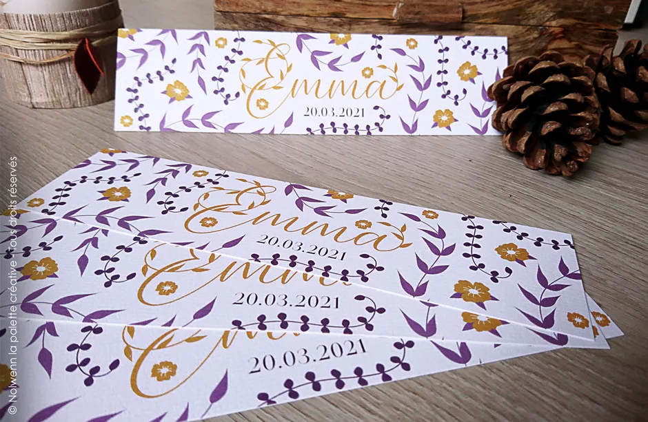 L’idée était d’avoir un format marque page avec quelque chose de fleurit, dans les tons violets et jaune.
